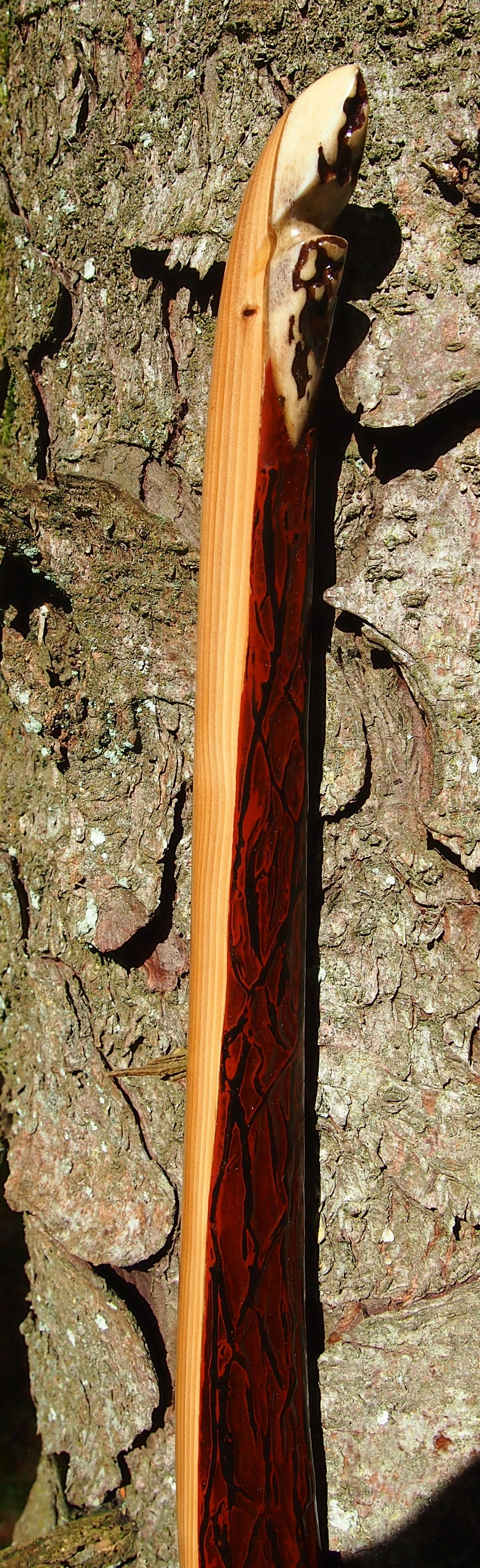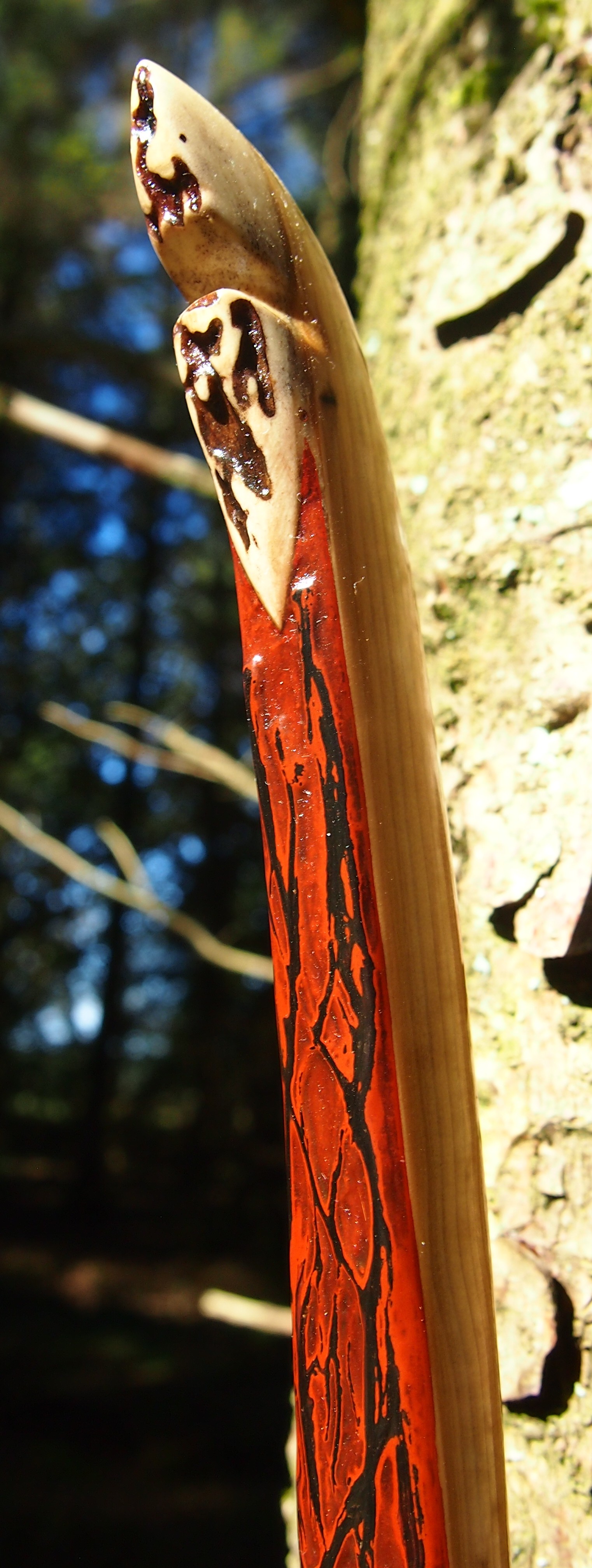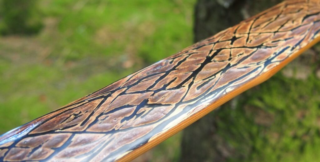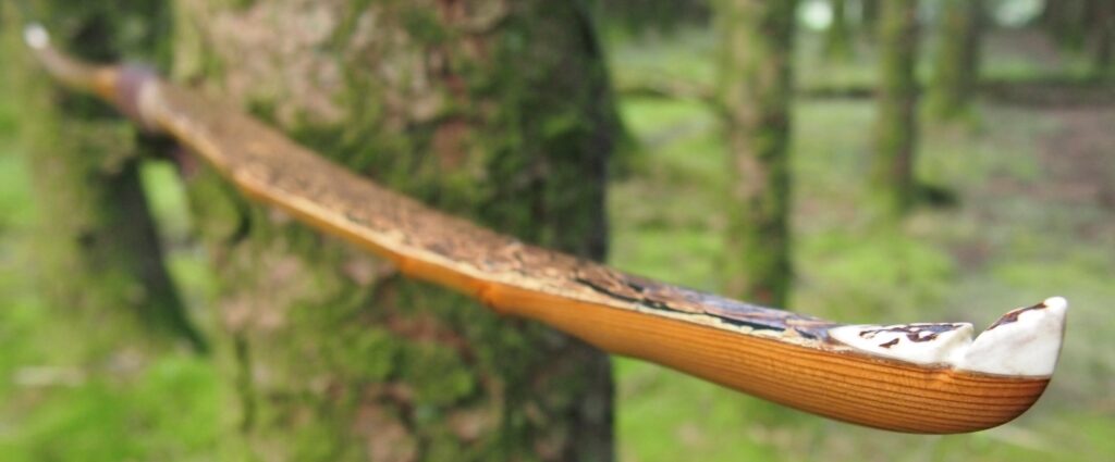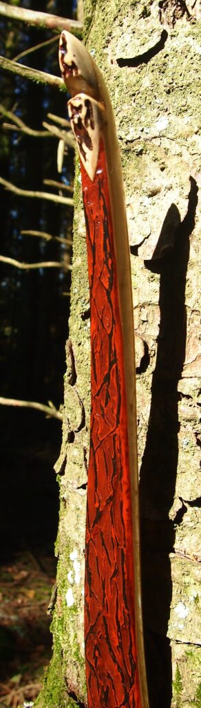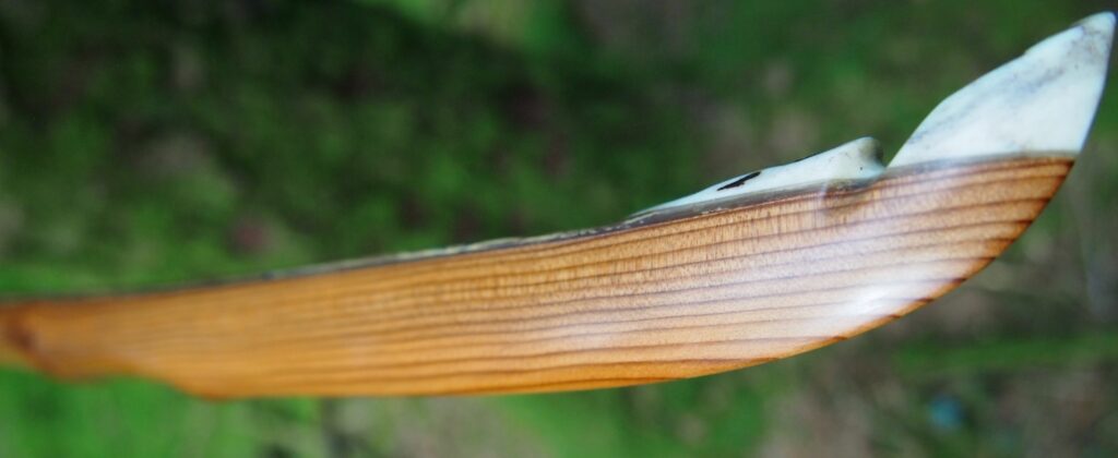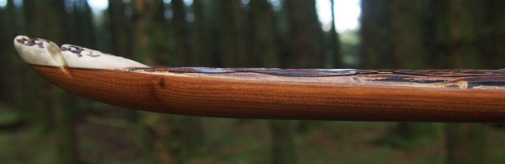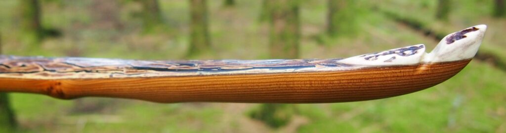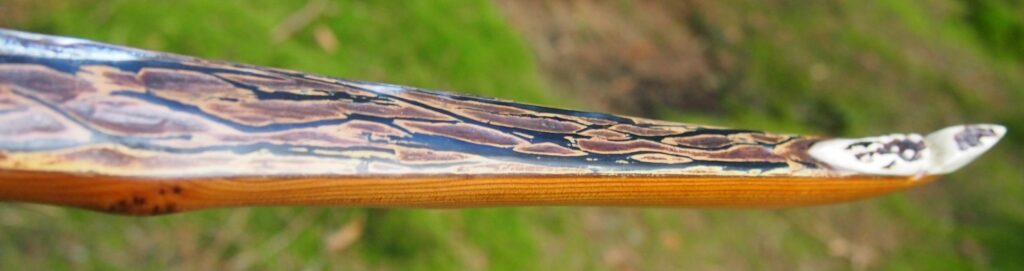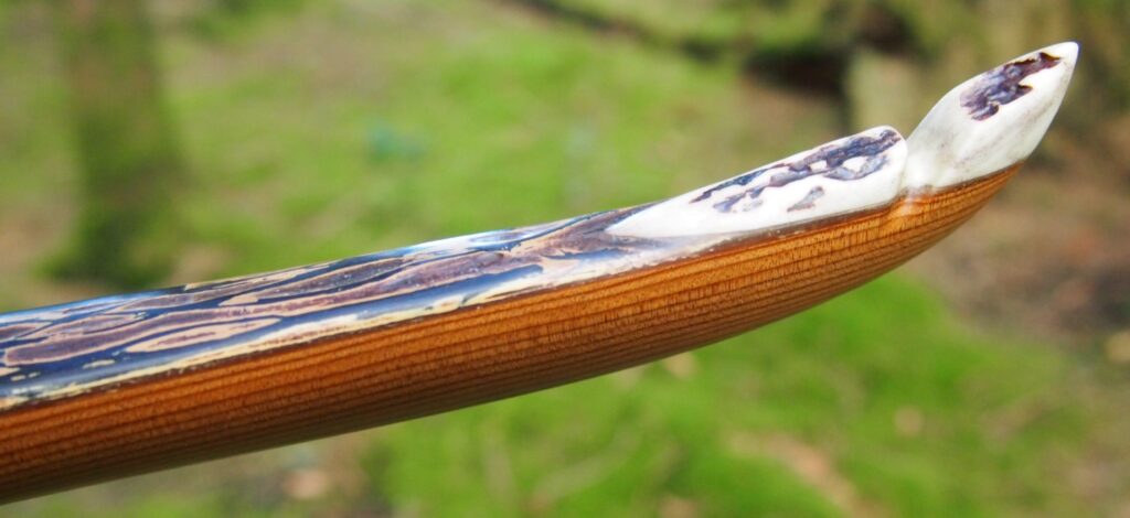 After refining the tips to minimise mass I fitted Wild English red deer antler tip overlays. I’ve also decorated the sinew backing in the exact same way as I’d described in my previous blog post which you can find here: Snakey Sinew backed Yew R&D Flatty (Zombie Killer) Bow No: 25 – Southmoor Bows