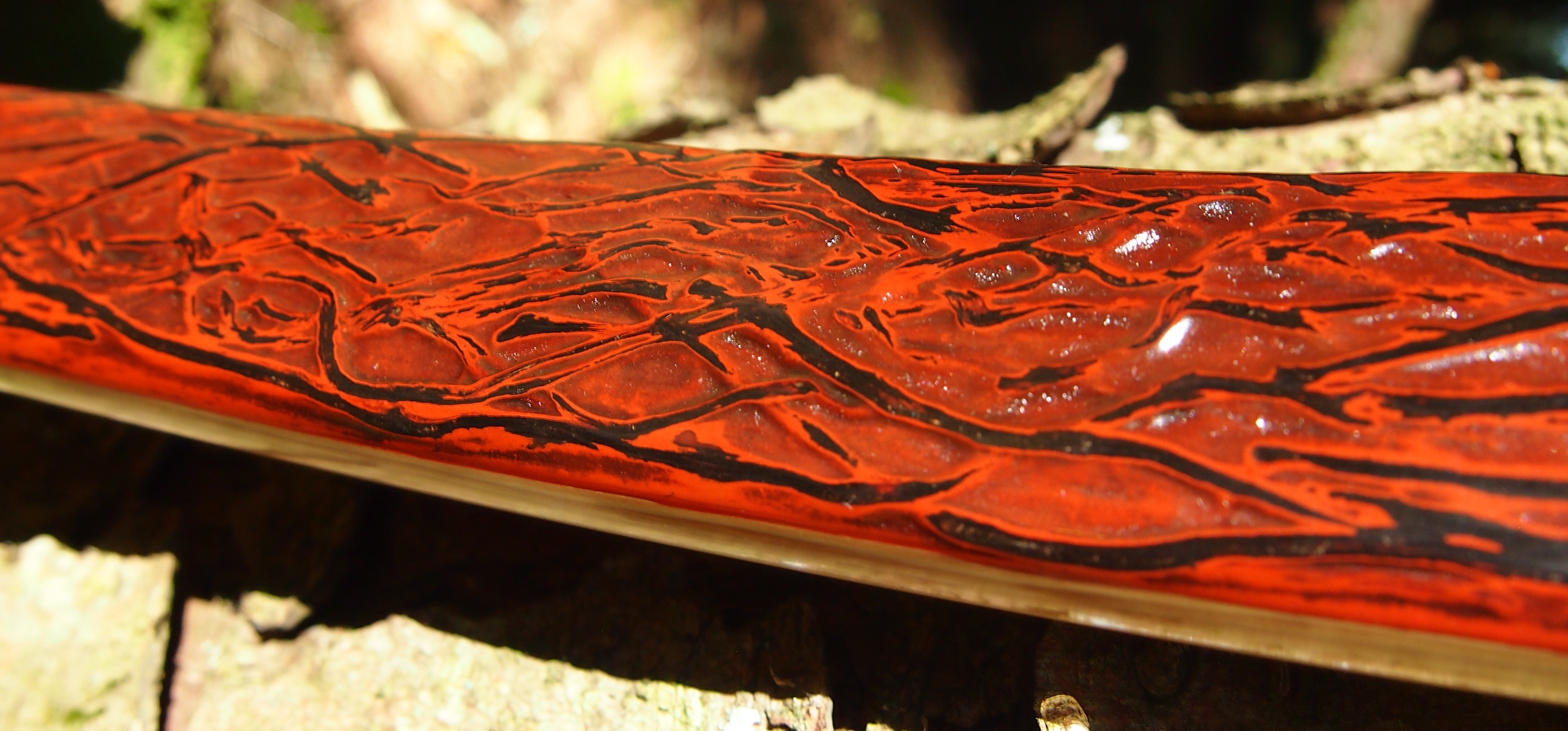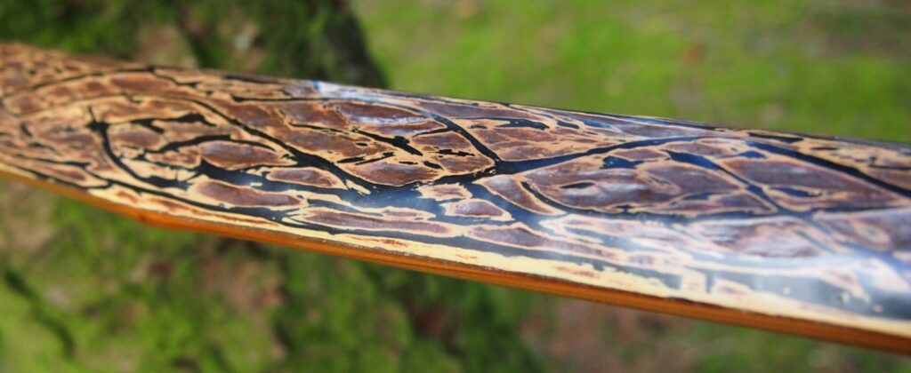 This time though I used a local Devon culm clay earth pigment as the underlying yellow/cream base colour. This contrasted wonderfully with the jet black sinew stands creating the mycelia look amongst the sinew backing. The tan wash to finish the look of the backing is once again concentrated spruce bark tanning painted on top of the creamy yellow clay pigment, then sanded/scraped through to expose the yellow/cream and dyed black sinew below. The tannin wash created a wonderful almost camo bark like affect on top of the creamy yellow, which almost looks like a natural creamy yew sapwood colour. This creamy yellow colour is fitting given the complete absence of any actual sapwood!