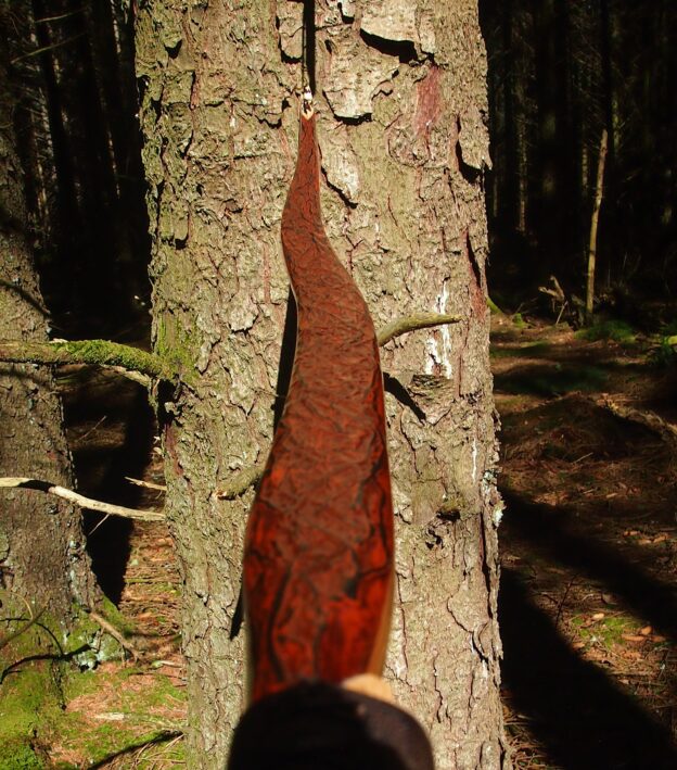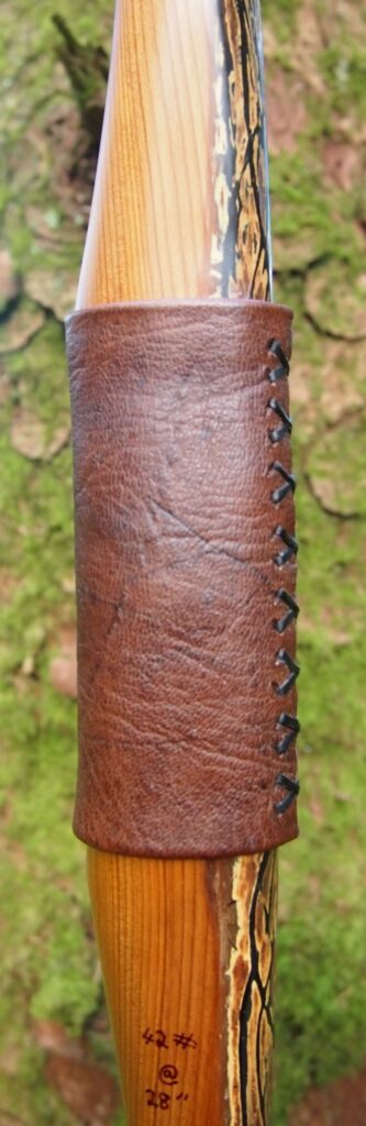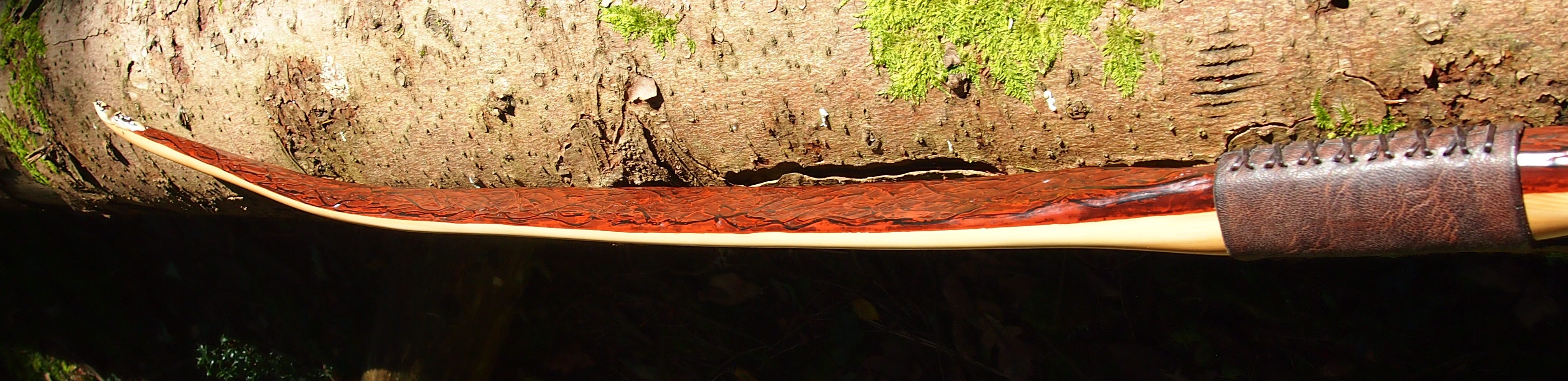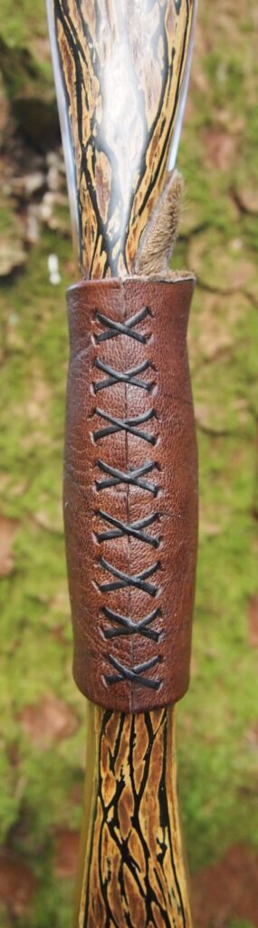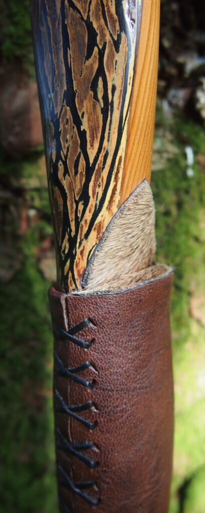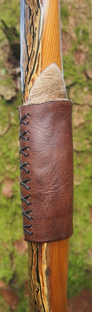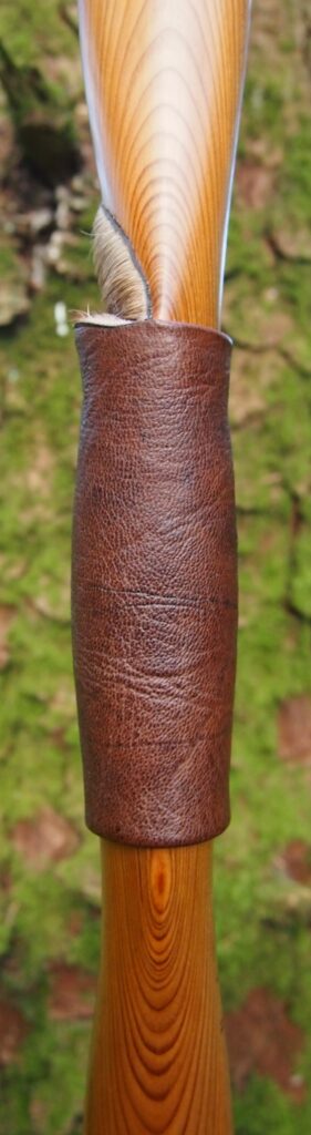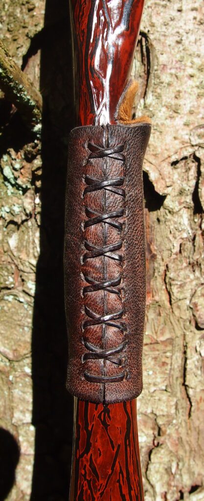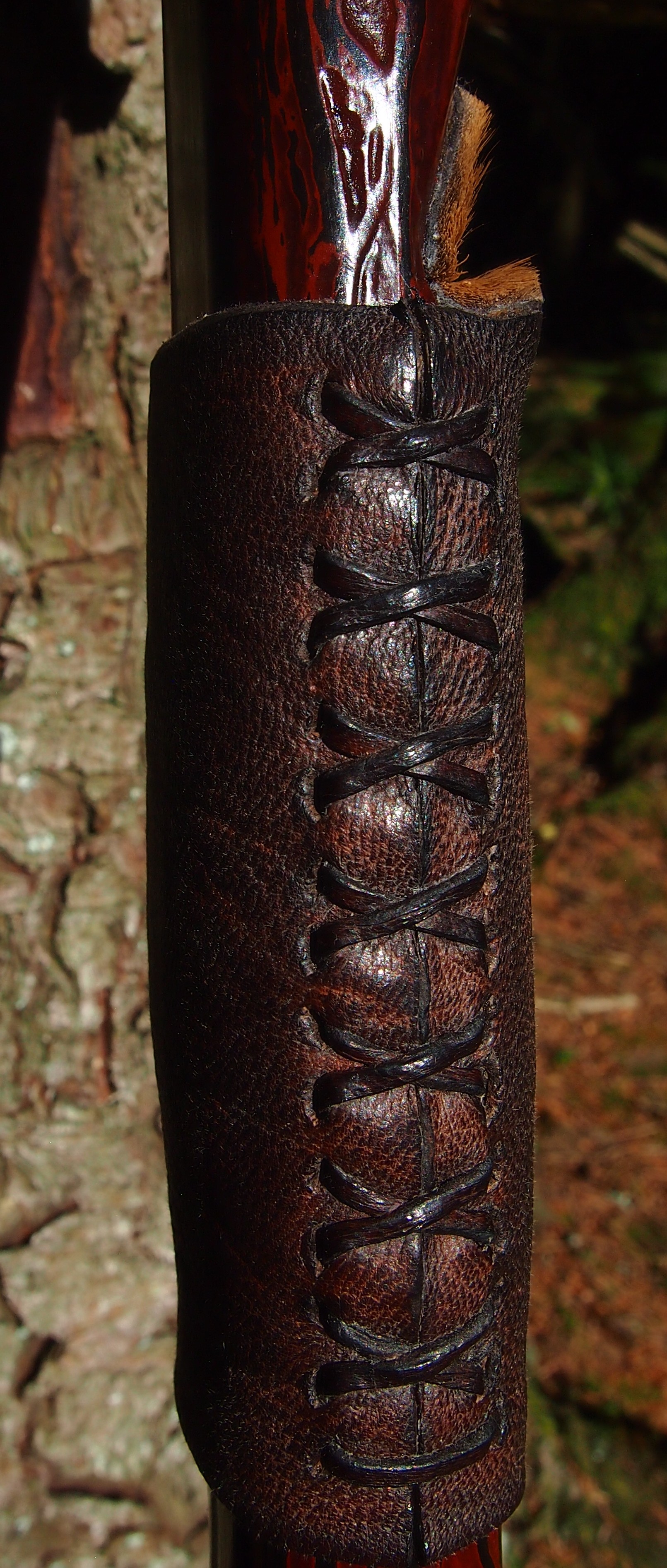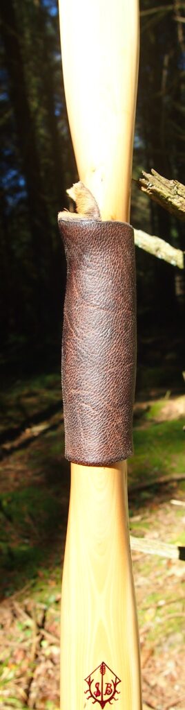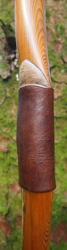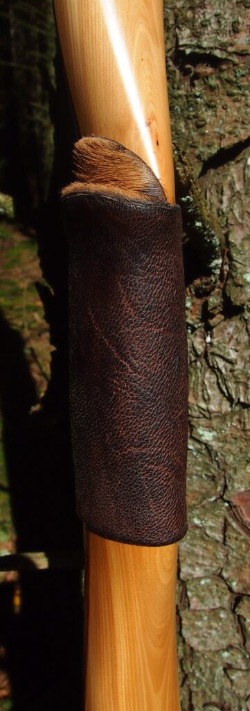 For the handle wrap and lacing I used some of my home produced spruce bark tanned red deer leather. And for the arrow shelf/pass I used my own produced bark tanned red deer hair on shin leather. I love this material for arrow passes as its both silent to shoot across and really hard wearing.