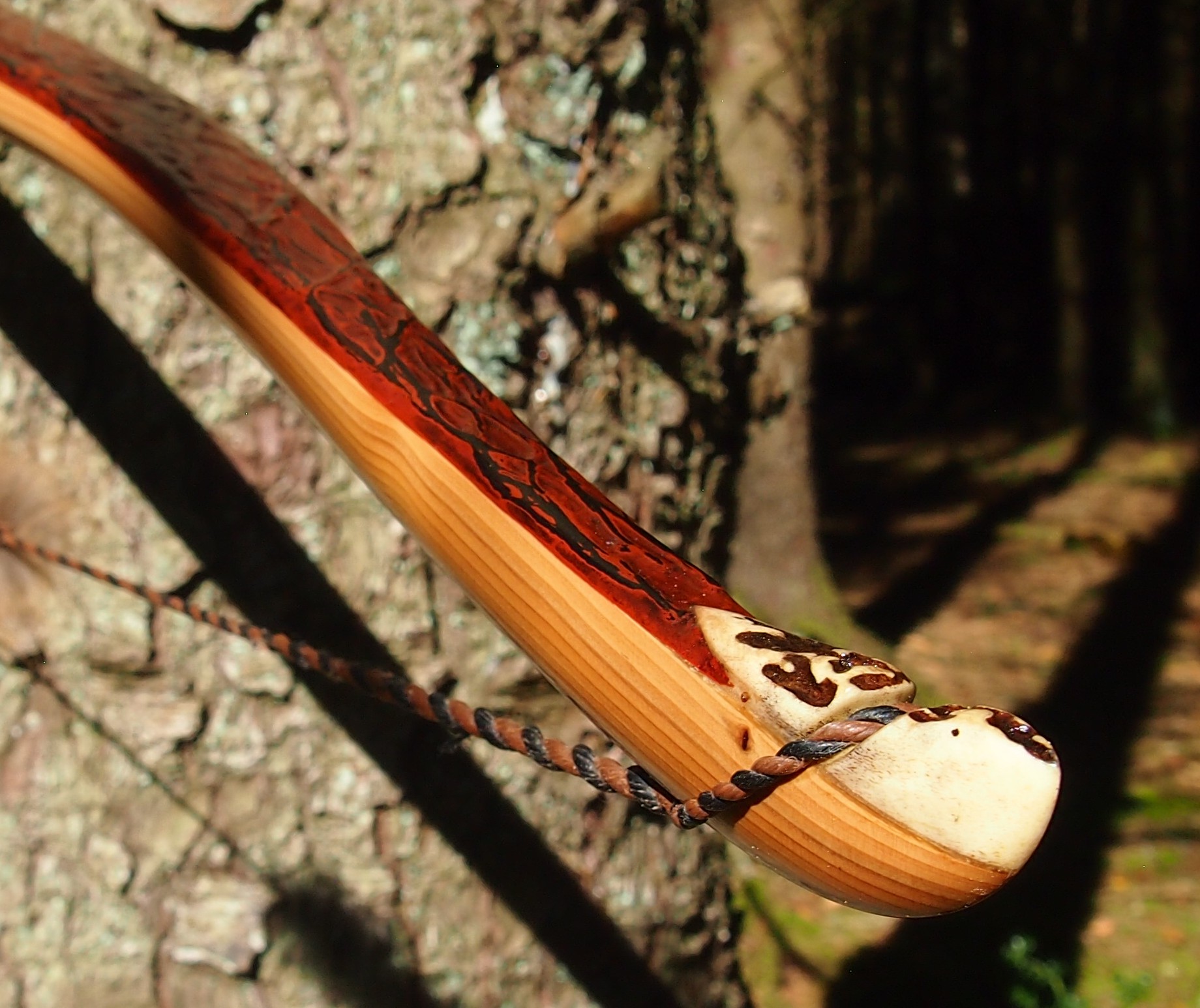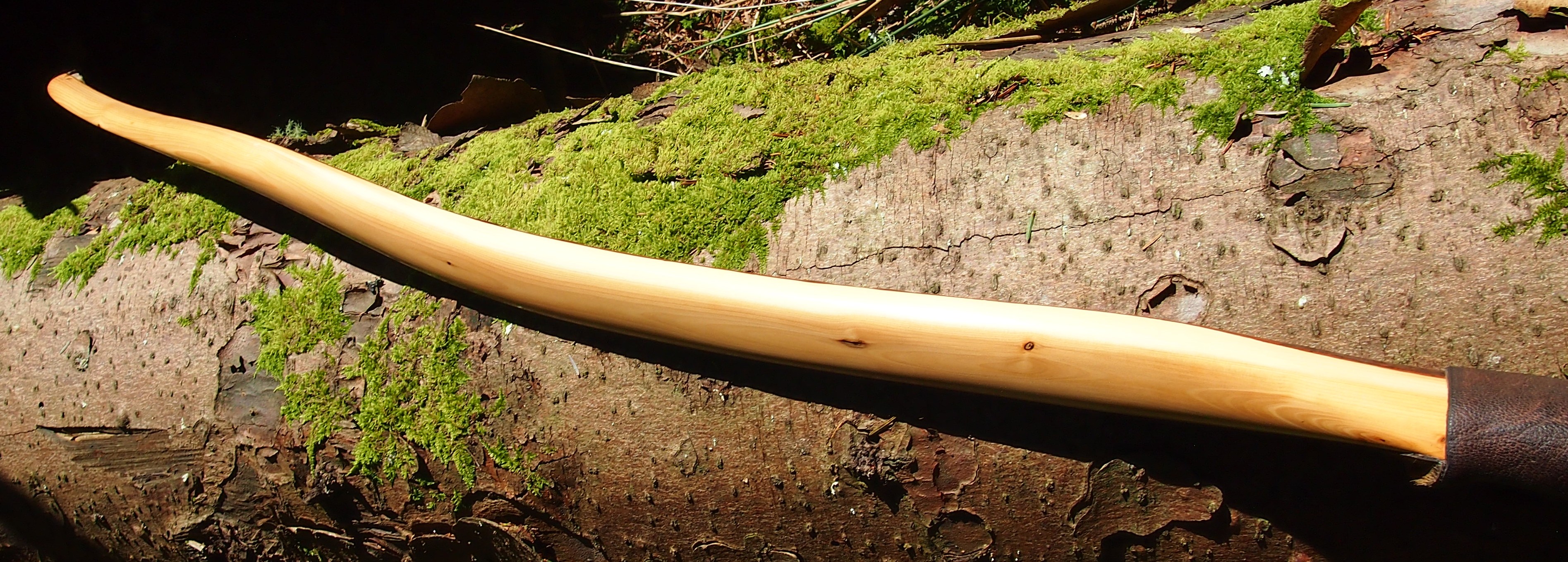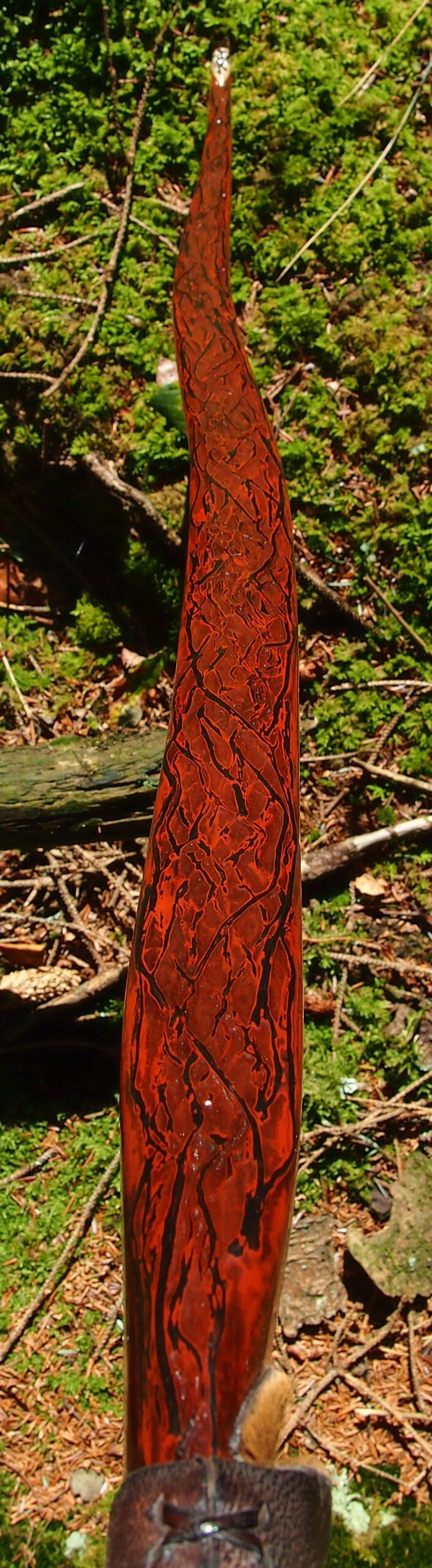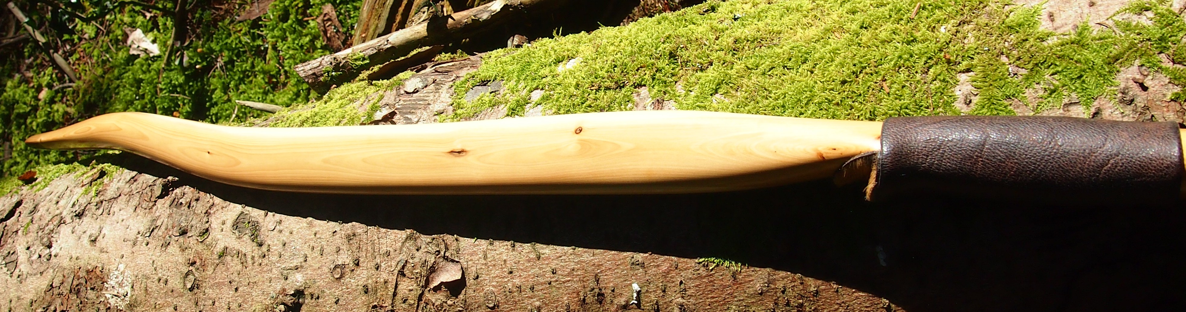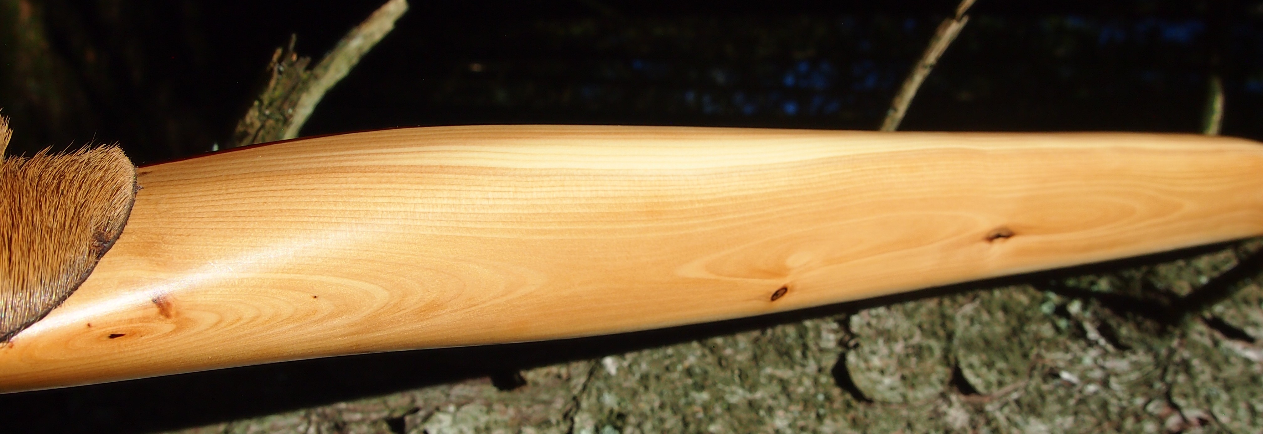 For the handle wrap and lacing I used some of my home produced spruce bark tanned red deer leather. And for the arrow shelf/pass I used my own produced bark tanned red deer hair on shin leather. I love this material for arrow passes as its both silent to shoot across and really hard wearing.