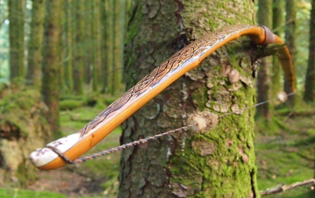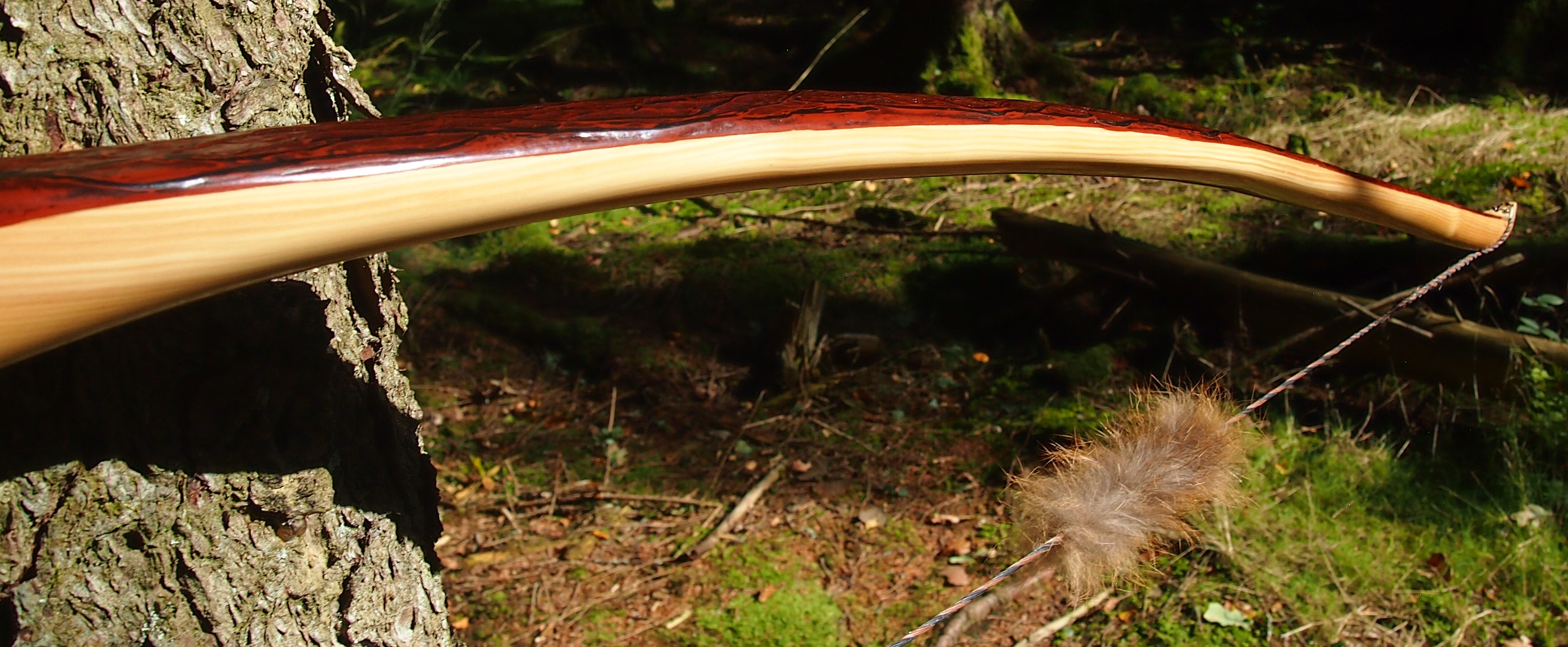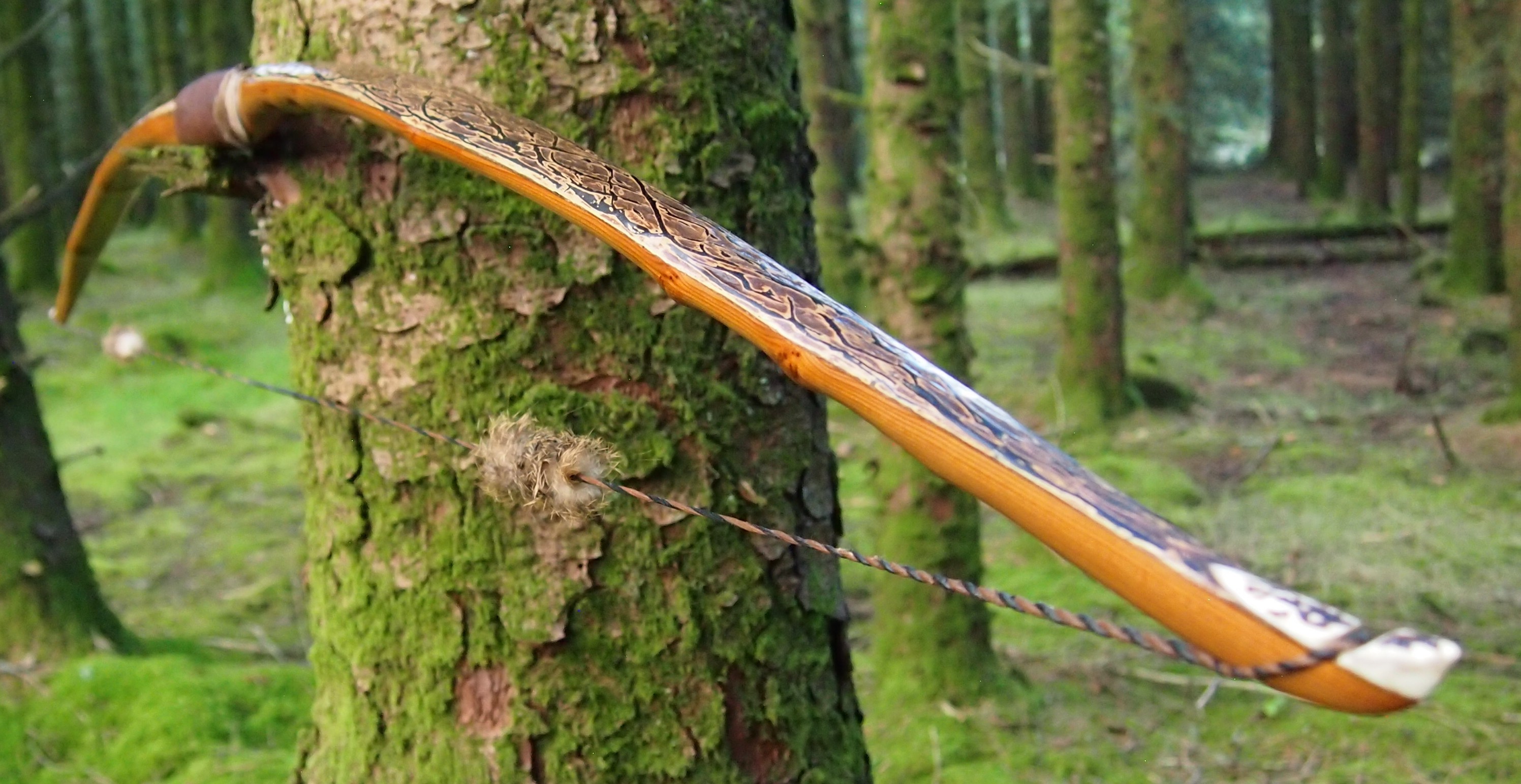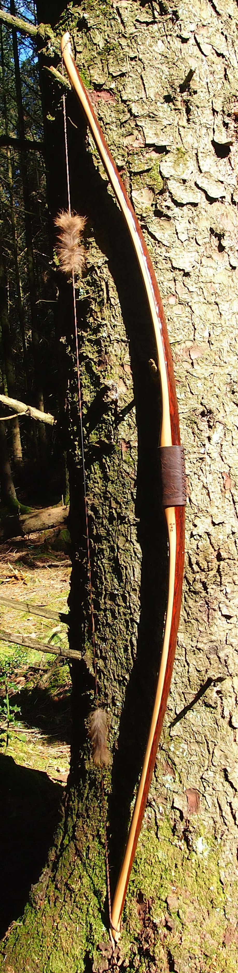 The string is 12 stands of B55 fitted with double loops and my own produced bark tanned wild brown hare fur puffs for silencers making this bow whisper quiet to shoot.