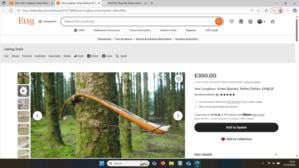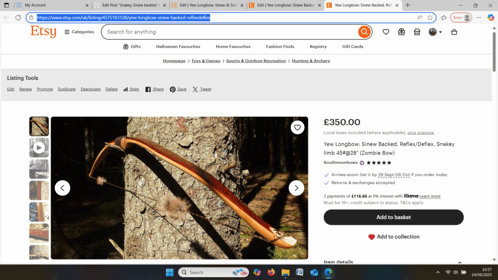 So here she is. I hope you enjoy the look as much as I do, and please feel free to leave a comment below telling me what you think. This bow is now available to purchase in my ETSY shop here: Yew Longbow: Sinew Backed, Reflex/deflex 42#@28″ – Etsy UK